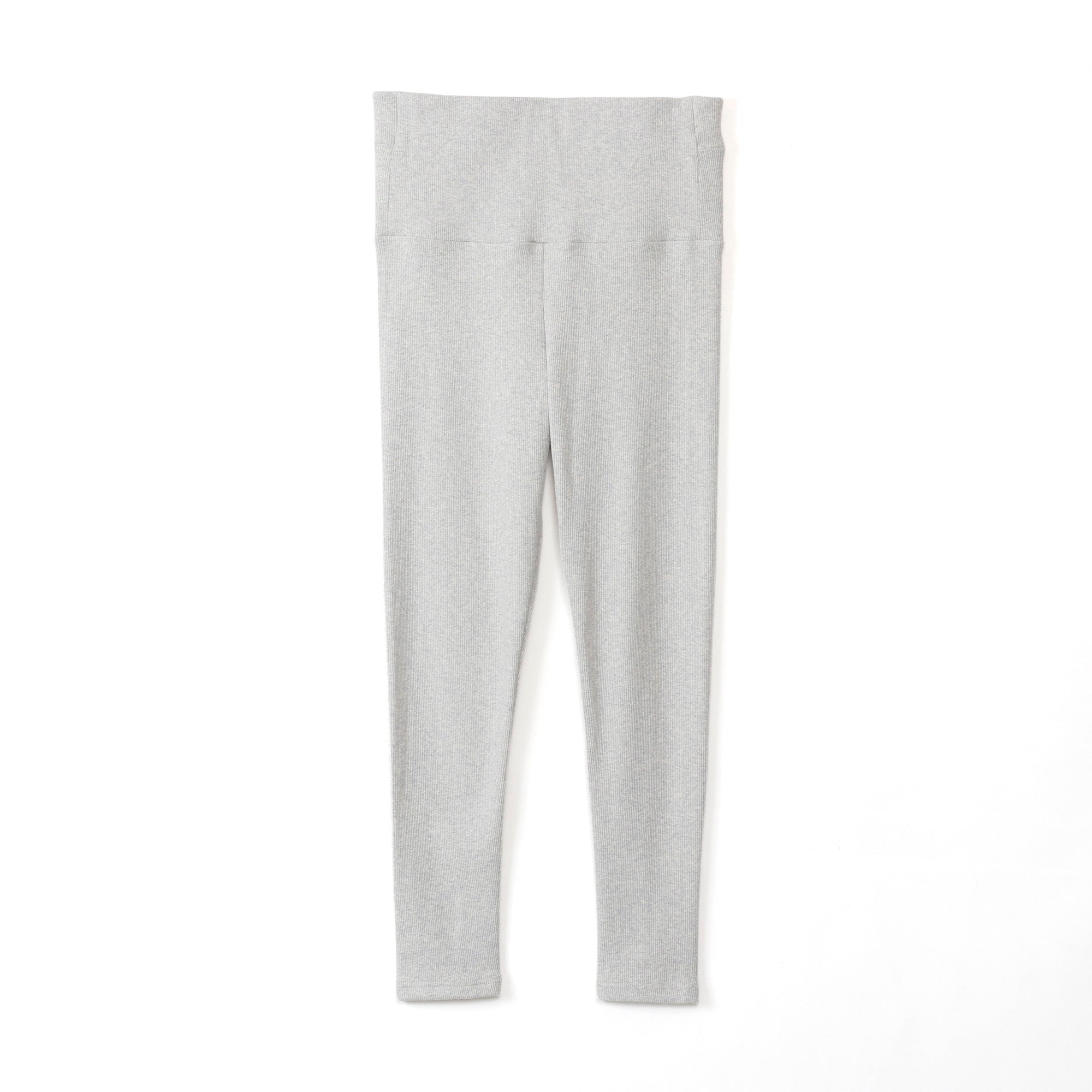 オーガニックコットン95%, ポリウレタン5%の伸縮性豊かな細かいリブ生地のフィット感を生かし、ハイウェストと太いウェストバンドで締め付け感を緩和したレギンス。ウェストの寸法を見直しゆとりをプラス。ゴムが苦しくなく心地よくお召いただけるフィット感に。また股部分のシワがでないよう着厚を一定に改良しました。