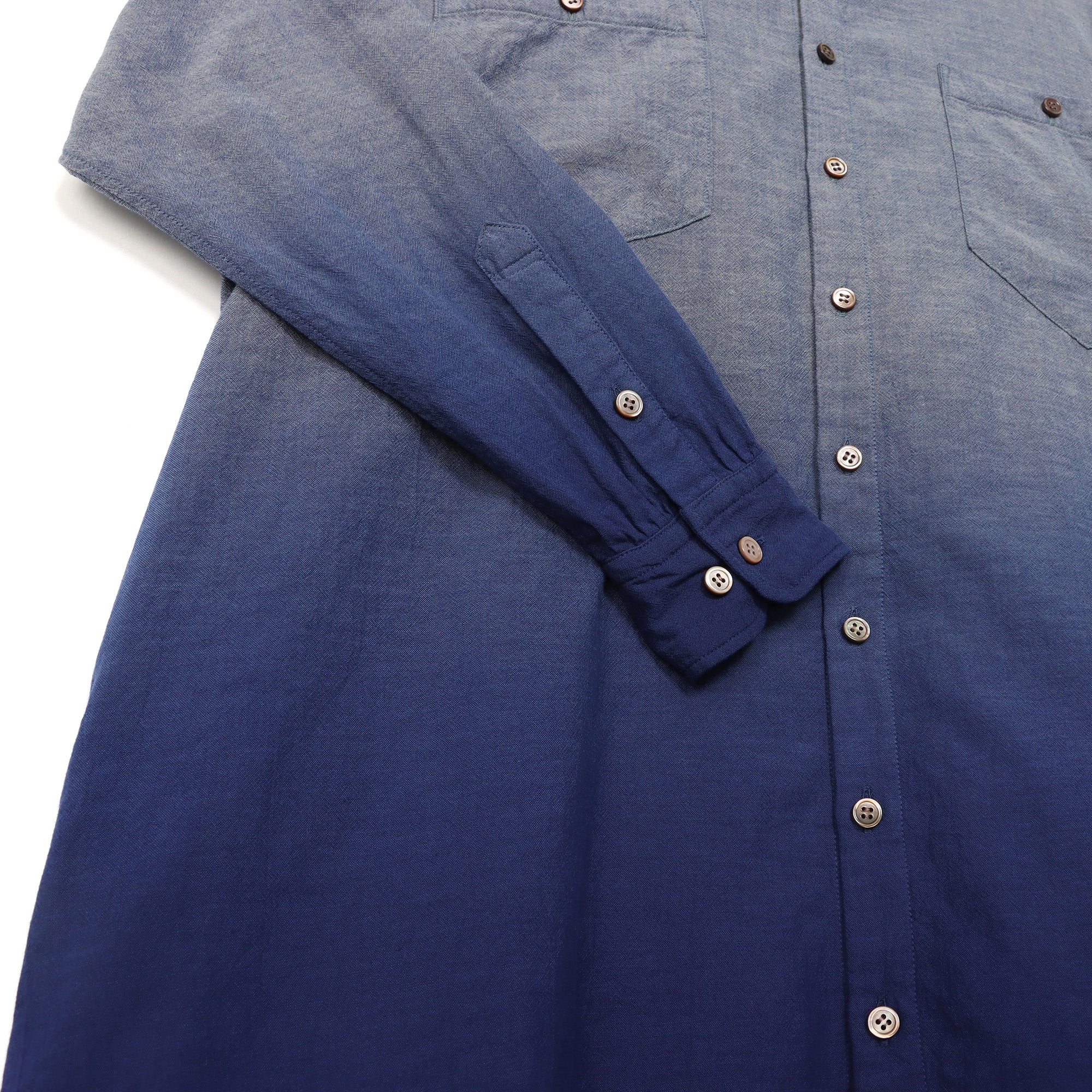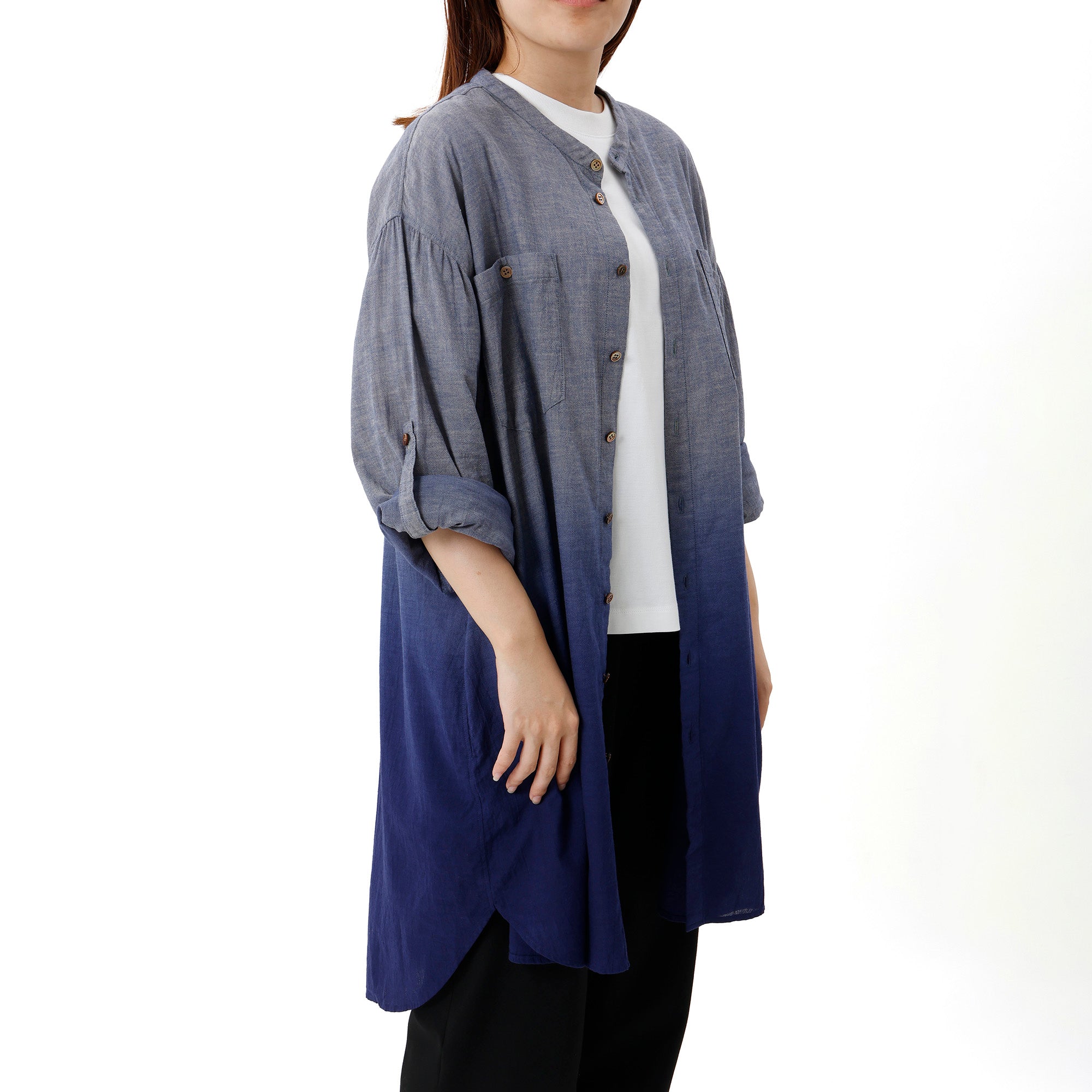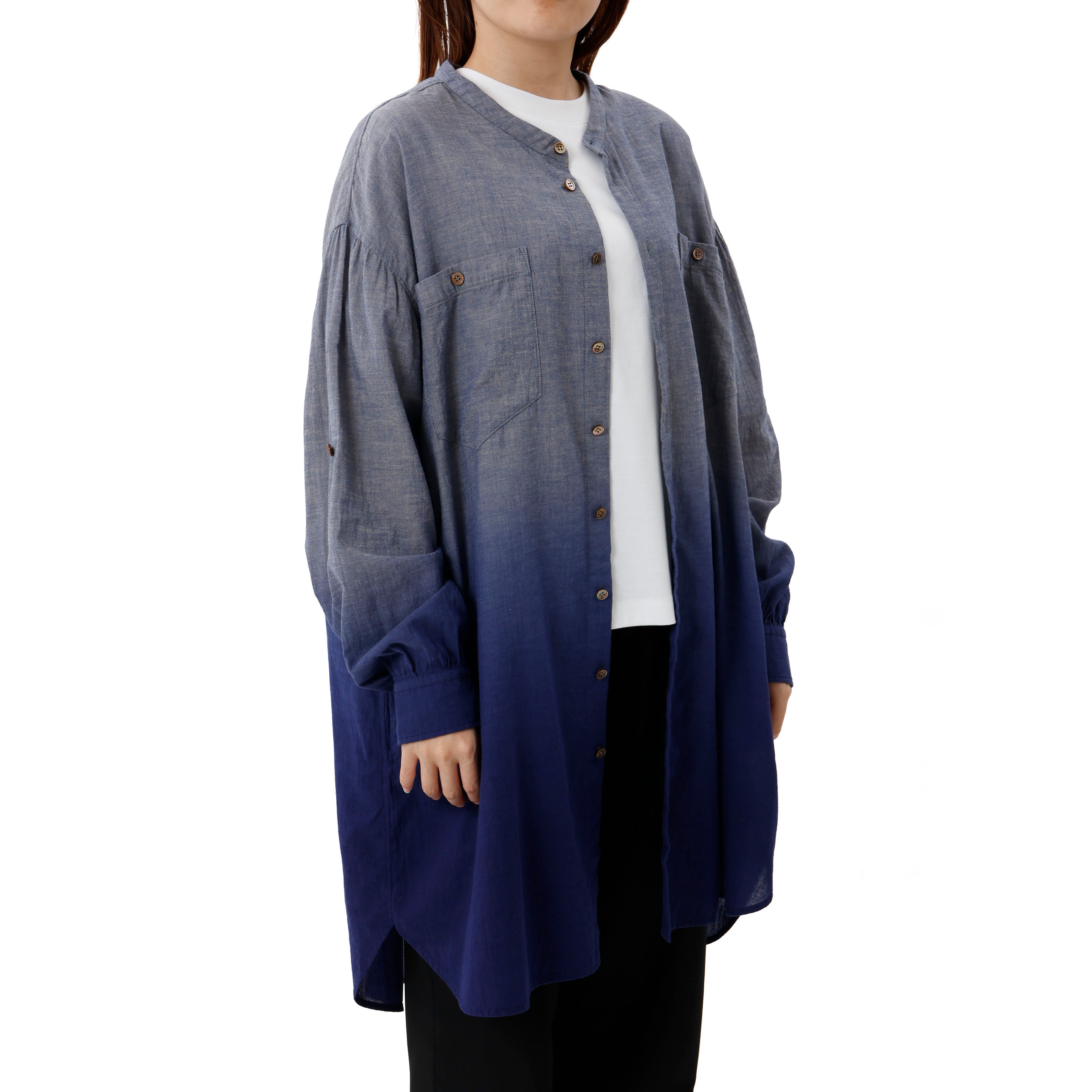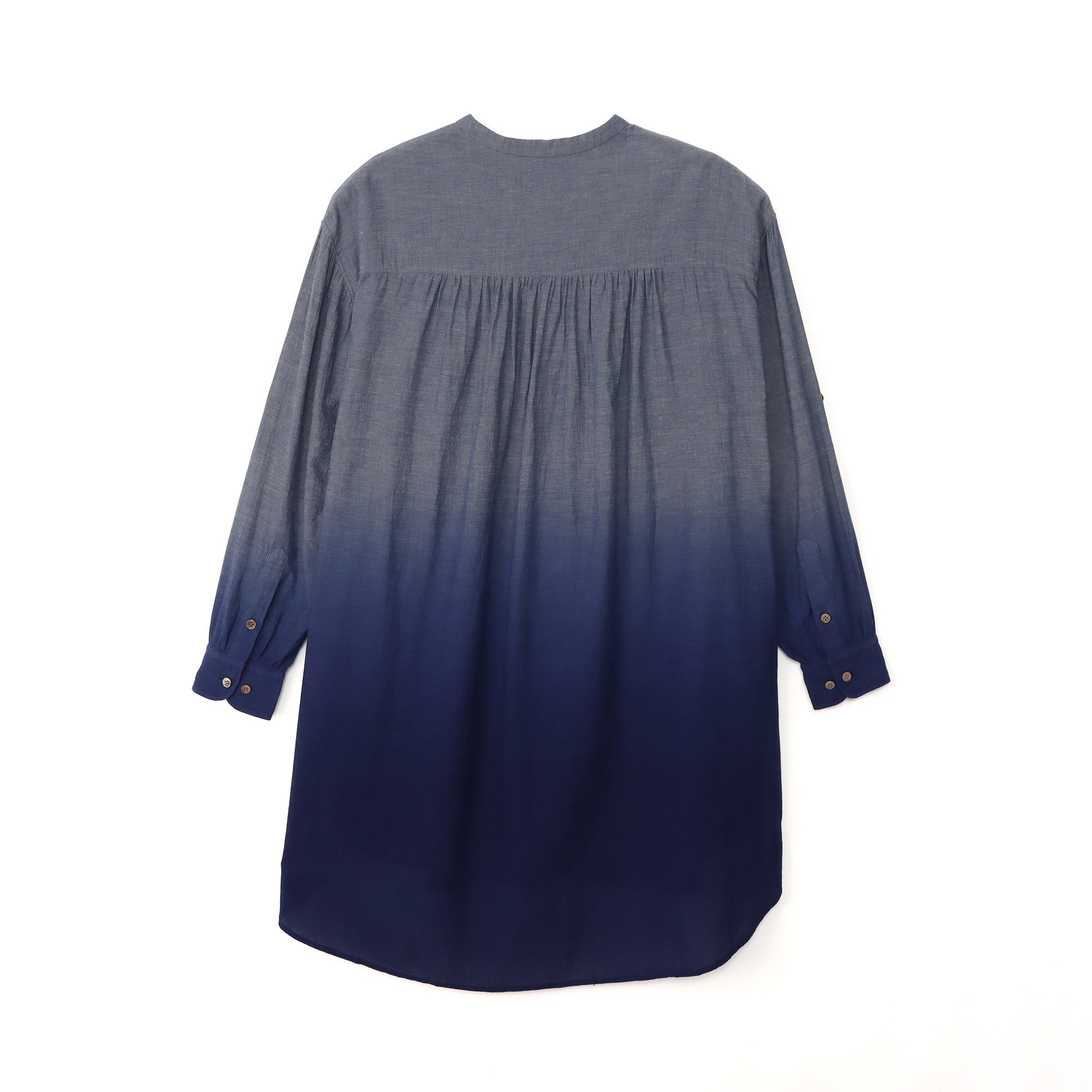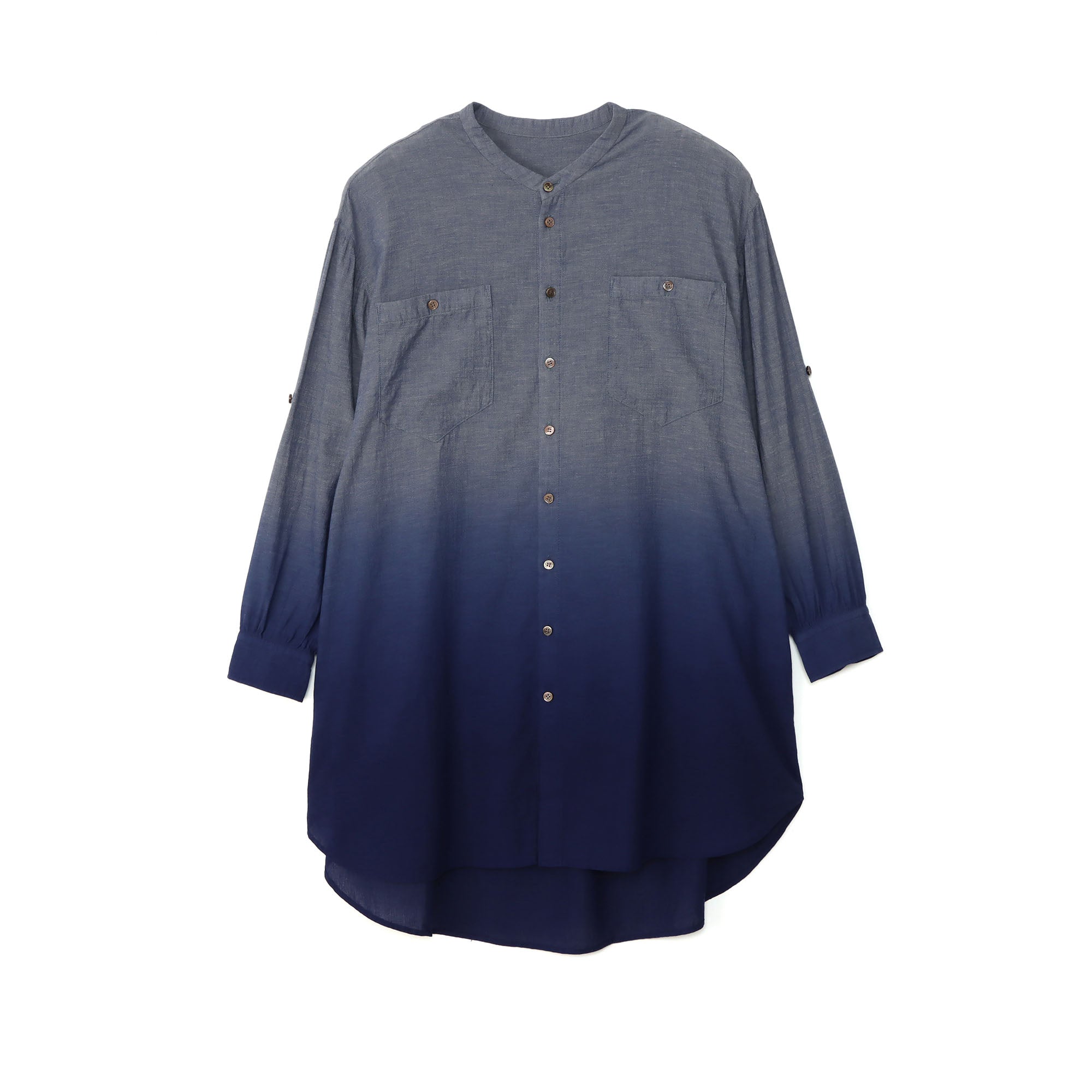 A long, collarless shirt made from cotton chambray gauze fabric, each piece dyed in a vibrant navy gradient.